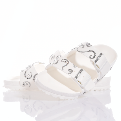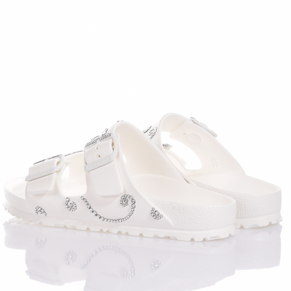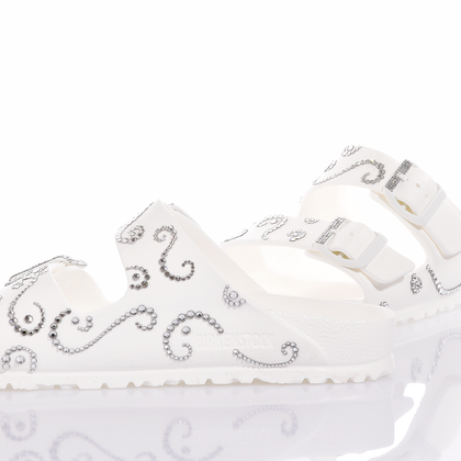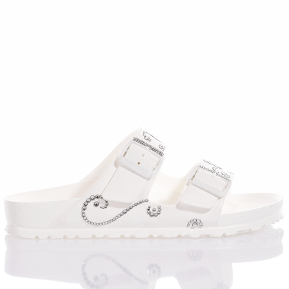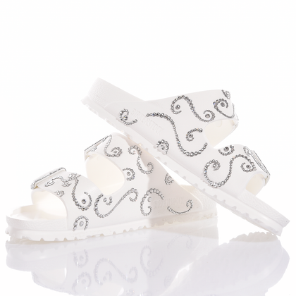 Birkenstock Arizona Athena: light, sparkling, and glamorous! The iconic Birkenstock model in total white, adorned with shining Swarovski crystals.