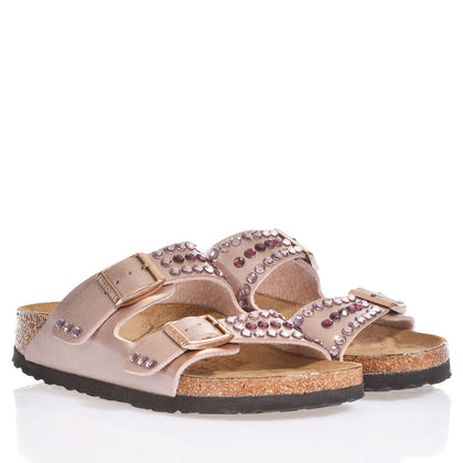Birkenstock Arizona Copper Swarovski: The warm, metallic copper base is elevated by rows of oversized Swarovski crystals in vibrant fuchsia and amethyst shades. A dazzling mix of light and color enhances the iconic silhouette with a bold, feminine touch—while keeping the unmistakable Birkenstock comfort.