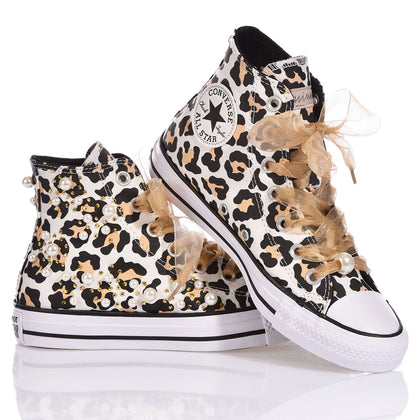 Converse Leo Pearls is the perfect sneaker to elevate any look with a blend of edge and romance. A leopard-print base with a cascade of pearls and Swarovski crystals, combined with distressed details, creates a bold contrast, while organza laces tie into a delicate, feminine bow.