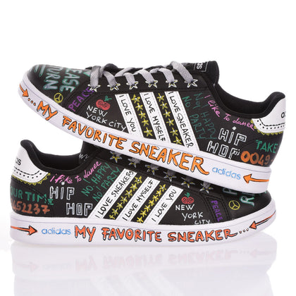 Adidas Black Board: Black base with white details, entirely covered in multicolor graffiti. The washed laces add a bold street touch to the look. Adidas Black Board also comes with its original laces.