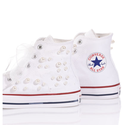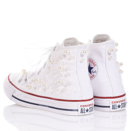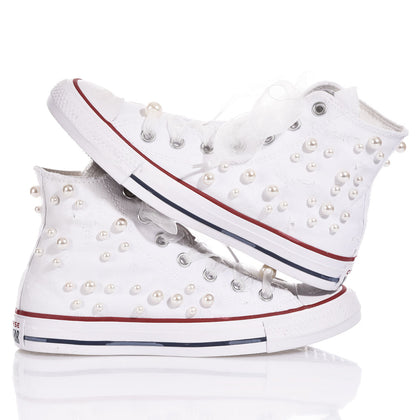 Converse Pearls White is the perfect sneaker to elevate any look with a blend of edge and romance. A cascade of pearls and Swarovski crystals combined with distressed details creates a bold contrast, while organza laces tie into a delicate, feminine bow.